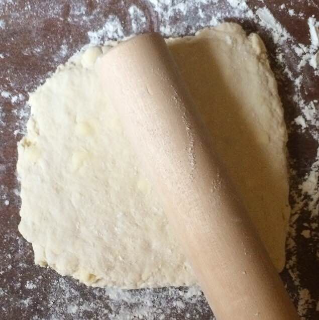 Now, flour a rolling pin. Use it to give the rectangle of dough three or four good thwacks (technical term). Flip the rectangle over, and thwack it again. Do this twice on each side. Why are we beating up our dough? We are knocking air into the layers. Have you ever heard of beaten biscuits? During the Depression, baking powder was rationed, but people still needed to make biscuits. Biscuit dough was “beaten” to encourage a good rise. Even though we have access to baking powder nowadays, beating the biscuit dough still helps to ensure that we have tall, flaky biscuits.