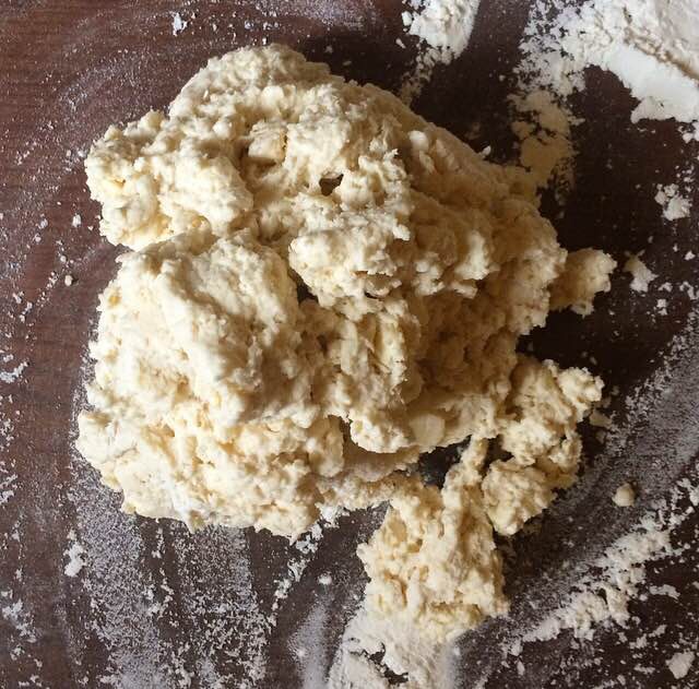 Pour in 3/4 cup cold buttermilk. Stir with a rubber spatula or wooden spoon until a shaggy dough forms. If it seems dry, add more buttermilk by the tablespoon.