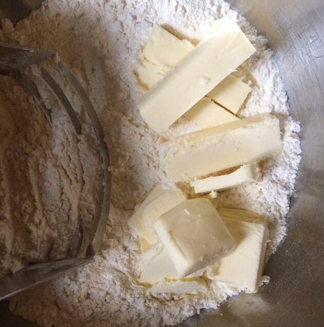 Cut your stick of butter into two 4 Tbsp pieces. Cut one piece into four sticks, and cut the other into very thin pats. Place all pieces into the bowl with the flour mixture. Using a pastry blender,* cut cold butter into the flour mixture until it is roughly the size of peas.