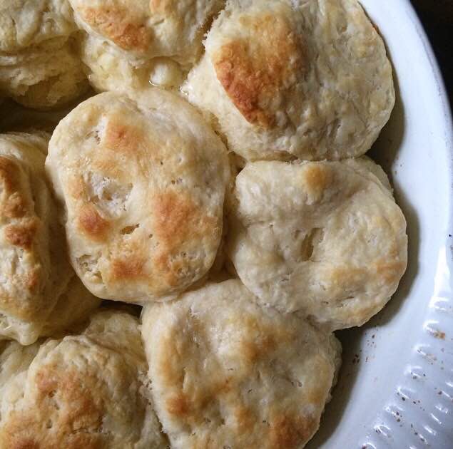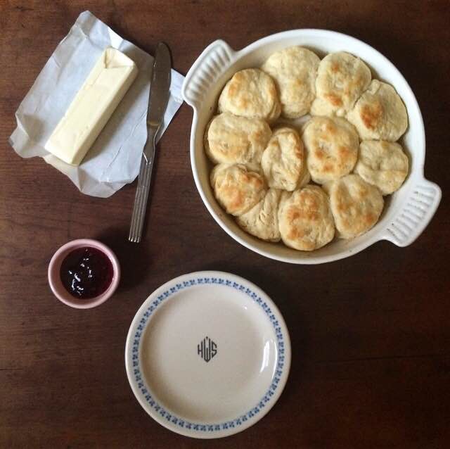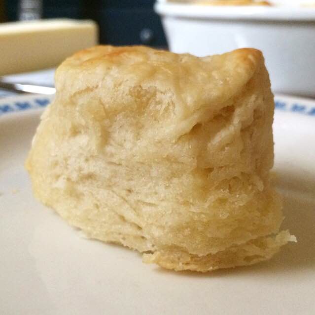 Use a 2 1/2-inch round biscuit cutter or sharp knife (not serrated) to cut the biscuits. Cut directly down. If you twist or saw, you’ll deflate all those layers that you just created. Place the biscuits close together in a buttered pie plate. Baking them all together encourages them to rise up, rather than out. Brush the tops with additional buttermilk, if you’d like. Bake the biscuits for 12-14 minutes at 400F, until they are golden brown and delicious-looking. Let them cool for five or ten minutes before serving with cold butter, jam, and/or honey.
