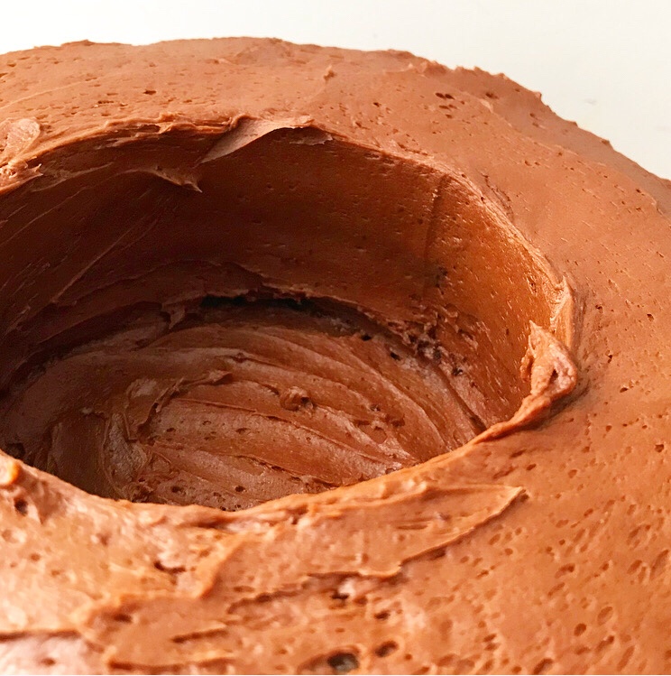 At this point, you’ll have a three layer cake with a hole in it. That’s where the surprise M&Ms are going to go ❤