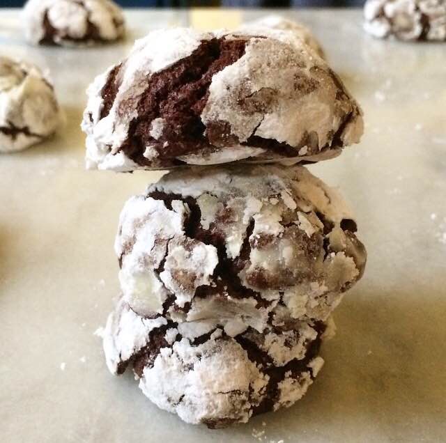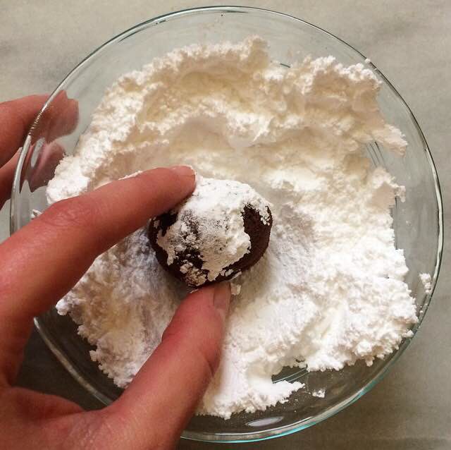 Scoop dough in 2 tablespoon increments and roll into balls. Roll dough balls in confectioner’s sugar and set at least two inches apart on prepared pans. Bake for 6 minutes, then rotate the pans top-to-bottom and back-to-front. Do not overbake. Let cool on the pans for ten minutes before removing to a rack to cool completely. Repeat with all remaining dough.