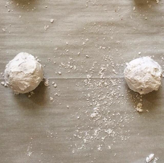After a short chill, the dough will be very thick. Scoop it in two tablespoon increments, roll them into balls, and coat them in confectioner’s sugar. Slide them into the oven and just over ten minutes later…