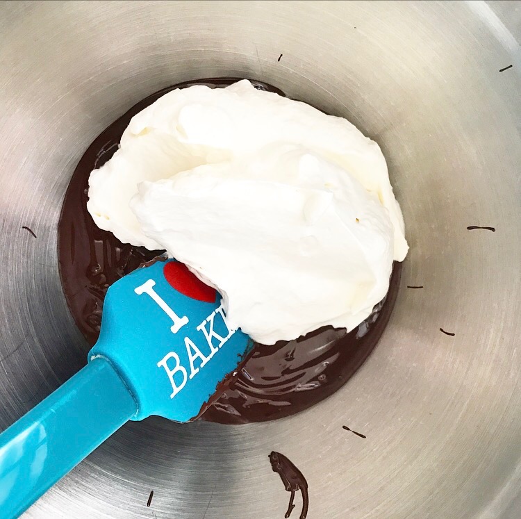 Transfer melted chocolate to a medium-large mixing bowl. Use a silicone spatula or wooden spoon to stir the cocoa powder mixture and 1/3 of the whipped cream into the chocolate. Gently fold the remaining whipped cream into the chocolate until no white streaks remain.