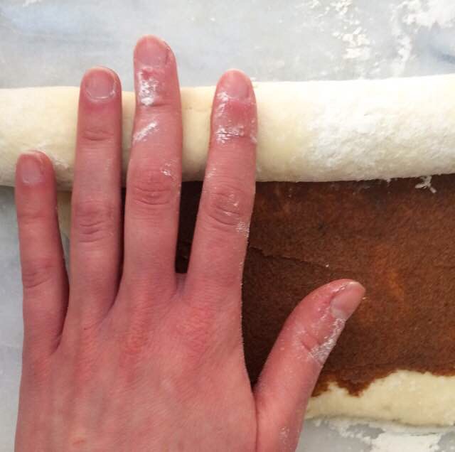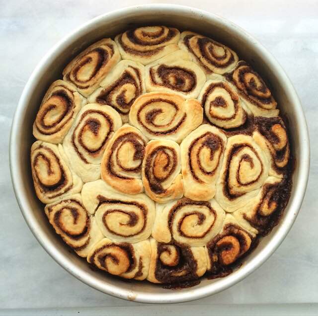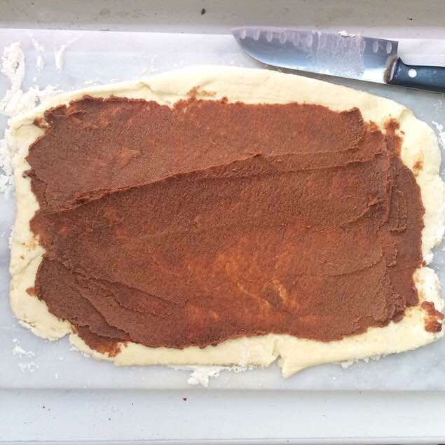On a floured surface, roll half the dough into a 10×14-inch rectangle so that the edge closest to your body is 14 inches. Drop spoonfuls of filling over dough and use an offset knife (or butter knife) to spread it out, leaving a 1/2-inch border at the edge. Scatter on reserved pecans. Starting at the long edge furthest away from your body, tightly roll the dough toward you until you have one large cylinder. Slice into 9 pieces, and place close together in the prepared pan. Bake rolls for 25-30 minutes, until light golden and fully cooked.