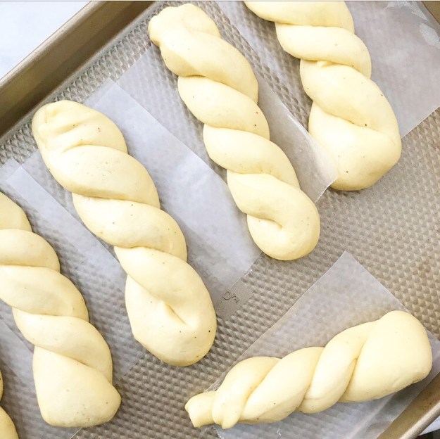 Place the twisted doughnuts on pieces of wax paper before putting them on a baking sheet. Let them rise for 30 minutes in a warm, draft-free place.