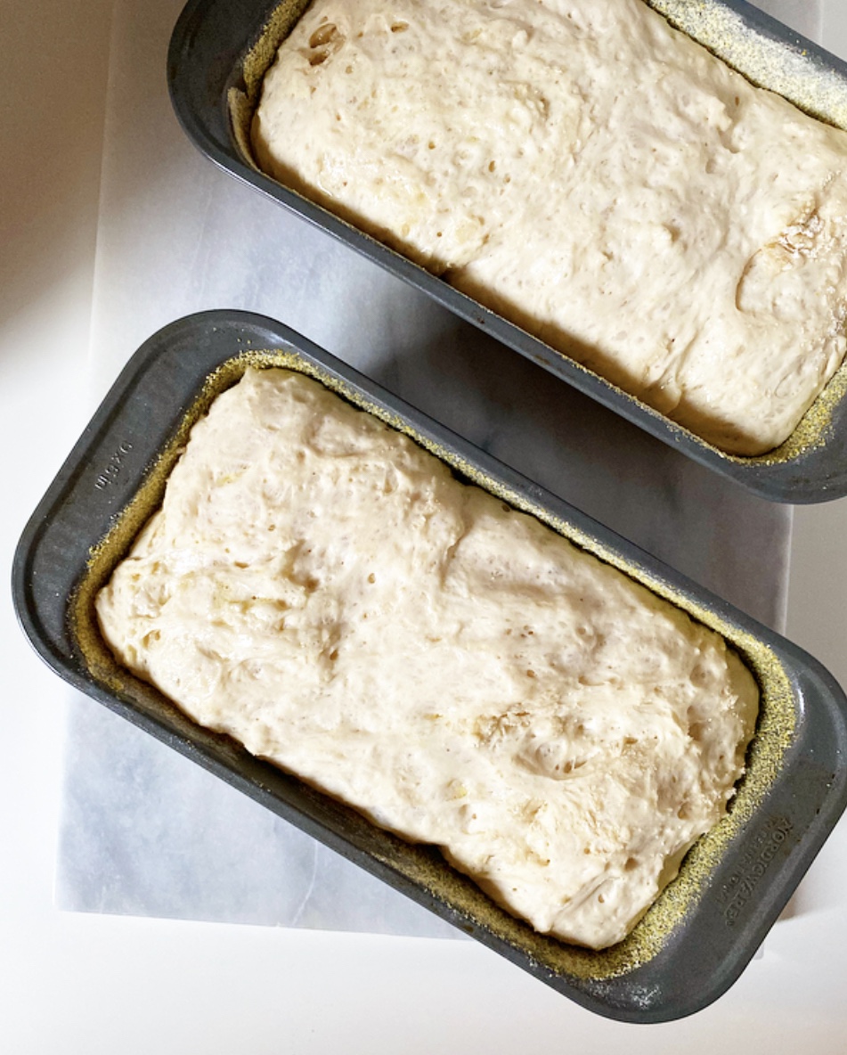 English Muffin Bread couldn’t be easier to make. Simply whisk together flour, a touch of sugar, kosher salt, instant yeast and a little baking soda, then stir in water and melted butter until a shaggy dough forms. Divide your dough in two, then put it in two cornmeal-dusted loaf pans. No, you didn’t miss a kneading step—thanks to the high volume of liquid and the desired texture, there’s no need to knead! <—see what I did there?!
