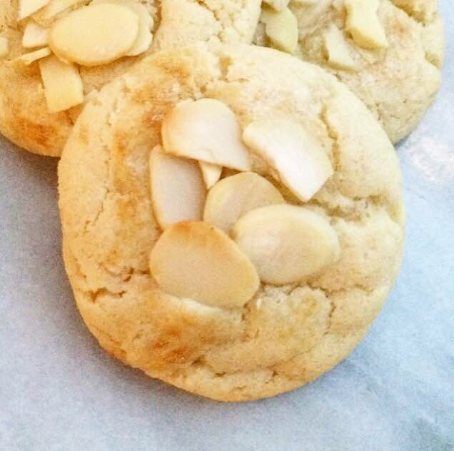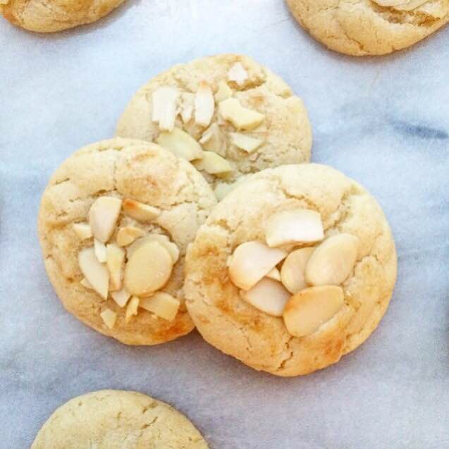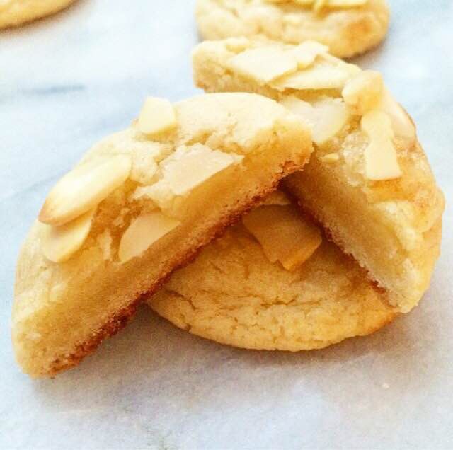 To decorate, toast almonds in a 350F oven for 5-7 minutes, until fragrant. Let cool completely. When petit fours have set, warm excess fondant slightly and load into a piping bag. Snip off a small corner and dot about a dime-size blob on top off one petit four, then immediately arrange five almond slices as a flower. Continue with remaining petit fours. Let set for another 20 minutes before serving.