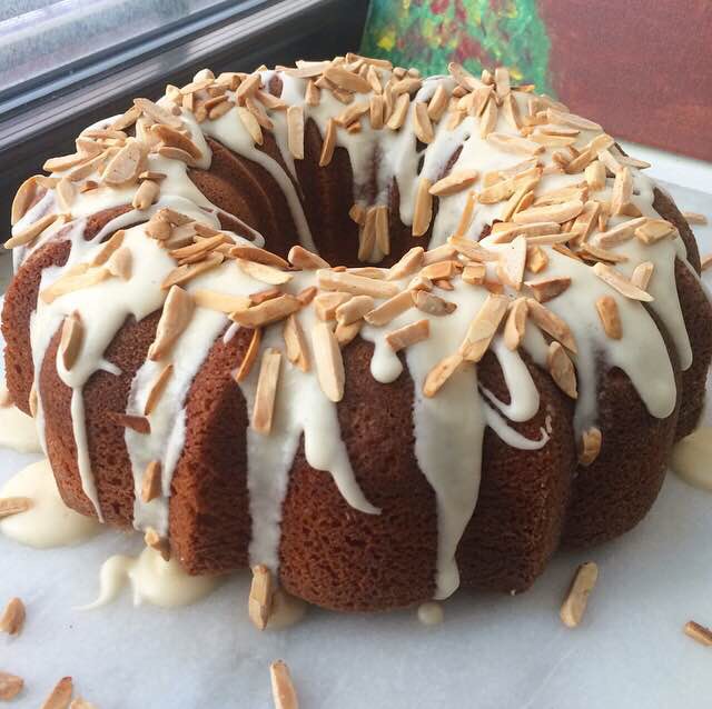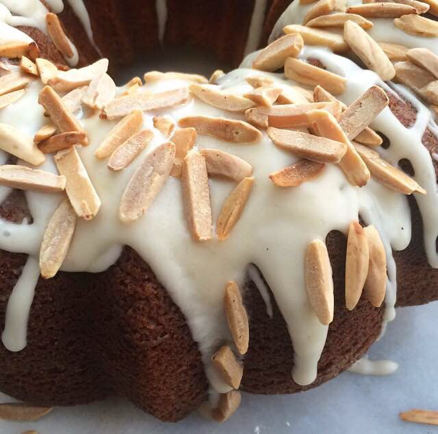 Make the syrup. Combine sugar and water in a small saucepan over low heat. Stir constantly until sugar dissolves, about 3-5 minutes. Remove from heat. Stir in vanilla and almond extracts. Paint syrup all over the top of the cake. It will seem like too much, but it’s not.