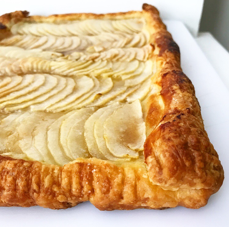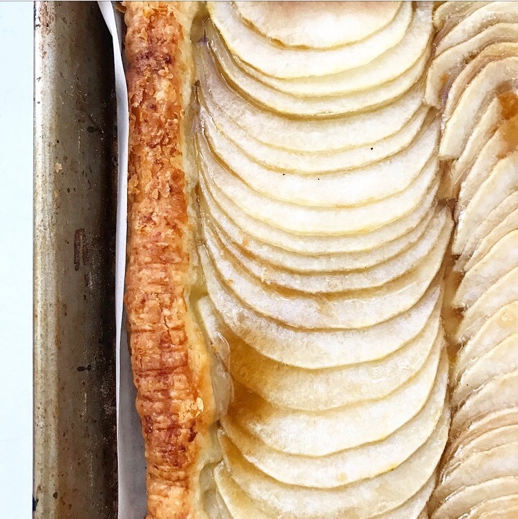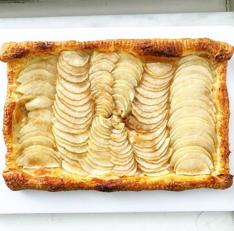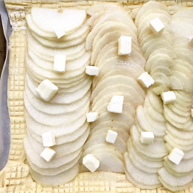 Don’t let these glamour shots deceive you–it’s surprisingly easy to make. Simply roll out a sheet of rough puff pastry (or the frozen thawed all-butter stuff), make a bunch of diagonal cuts down both long sides and fill the center with sliced pear filling.