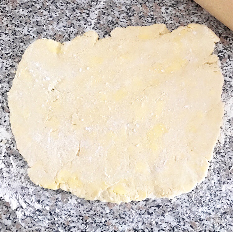 Flour a surface and a rolling pin. Roll pie dough out until it is 1/8-inch thick. Trim edges so that you have a 12-inch circle. Transfer to prepared pan. Mound filling in the middle of the dough, leaving at least 2 inches of excess on all sides. Fold dough over the sides of the filling to contain it. Dot exposed filling with butter.