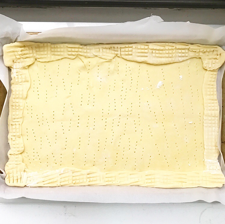 Alternating sides, carefully cover the filling with overlapping strips of dough, producing a braid-like appearance. Give it a brush of egg wash and a sprinkle of sugar, and then let it bake til golden.
