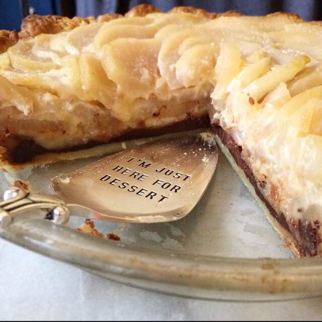 On our anniversary last year, Henry and I went to al di la, an absolute treasure of a restaurant in Park Slope, Brooklyn…with my parents. They were visiting and wanted to take us out to celebrate, and who were we to turn down a (very) nice free meal? At the end of a dinner that I’m still thinking about almost a year later, we decided to split a dessert. This is a big deal. You see, Henry’s not much for sweets. I make dozens of cookies every week (not to mention all the cakes and pies and cinnamon rolls), and he politely turns down almost all of them. He digs gingersnaps and chocolate cake without frosting, but that’s pretty much it. So when he wanted to split a dessert at this restaurant, I leapt at the opportunity. Seeing as he is pickier about sweets than I am (I just had a cookie and called it breakfast), I let him choose. And he went for the one thing on the menu that didn’t look wonderful to me: an almond cake with pears and bittersweet chocolate. You see, for me, fruit and chocolate don’t really go together. I mean, if you give me a piece of chocolate cake with raspberry filling, I’m not going to turn it down. (As a rule, I don’t turn cake down.) But it’s not my favorite. So when this cake showed up at the table, I expected to take two bites, say how good it was, and be finished with it. That’s where I was wrong. This cake was dense and rustic, with a good almond flavor, soft pieces of pear, and a magical layer of melted chocolate. I’m pretty sure I ate all of my half and most of Henry’s too. And here we are, two weeks away from our anniversary, and I’m still thinking about it…so I took that cake and made it pie.
