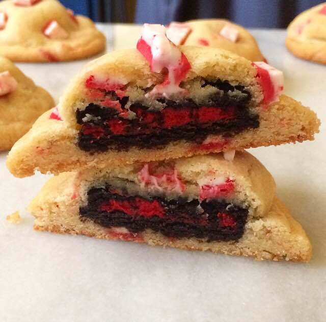 The only thing better than a cookie is a cookie stuffed with another cookie. Here, we use Double Stuf Oreos. Take your chilled dough out of the fridge. Scoop the dough by the tablespoon, and then flatten each scoop into a disc. Top half of the discs with Double Stuf Oreos, and top the Oreos with a second disc of dough. Then, use your fingers to pinch the edges of the discs toward each other and then smooth the seams a bit. Set the cookies at least three inches apart on prepared baking sheets. Bake them for 11-12 minutes, until lightly golden brown and no longer wet-looking. I like to top the finished cookies with some additional Andes Peppermint Crunch pieces, but this is purely for aesthetics and totally optional. Let these cookies cool for a few minutes before enjoying.