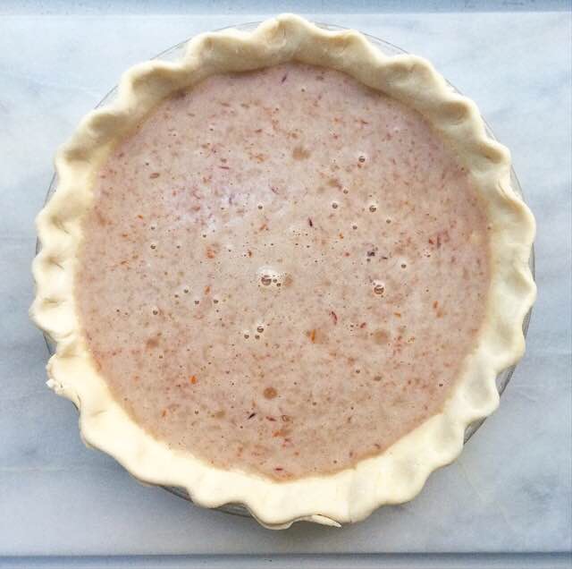 Pour the filling (which will be thin) into the pie crust and bake for 45-55 minutes at 350F, until the filling is firm. If the filling wobbles at all when the pan is jostled, keep baking or you’ll have soup. Everything will get puffy in the oven, but it’ll settle down while it cools.