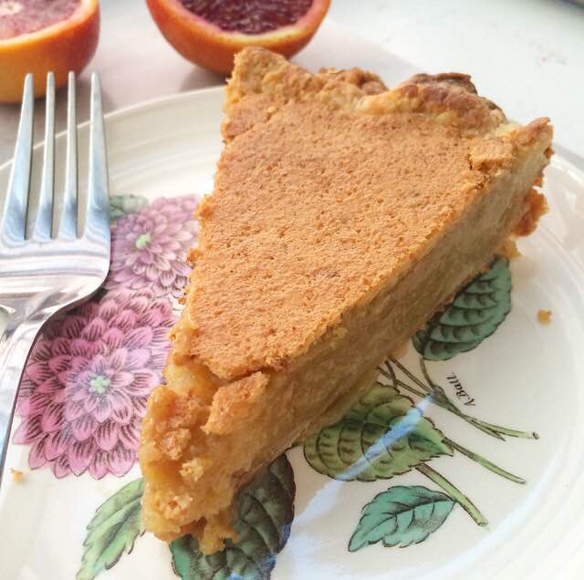 This chess pie is made with blood orange juice and zest, so the soft, custardy filling is perfumed with all sorts of orange goodness. I so hoped the interior would be some shade of pink or red, but the pigment of blood oranges dissipates with heat. But it doesn’t matter when it’s so simple and so good. If you really want a red or pink color though, I suppose you could add a few drops of food coloring, but I don’t think it needs it.