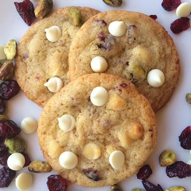 I would like to give a high five to whichever person decided white chocolate, dried cranberries, and pistachios is a Christmas combination. I don’t believe it was a part of any holiday parties or cookie exchanges I took part in while growing up, but I am all for it now. Aside from just being festive—love that red, green and white—it’s delicious, and a welcome departure from the chocolate, peppermint, and spice-heavy fare that seems to be available 24/7 in December. Not that I’m complaining.