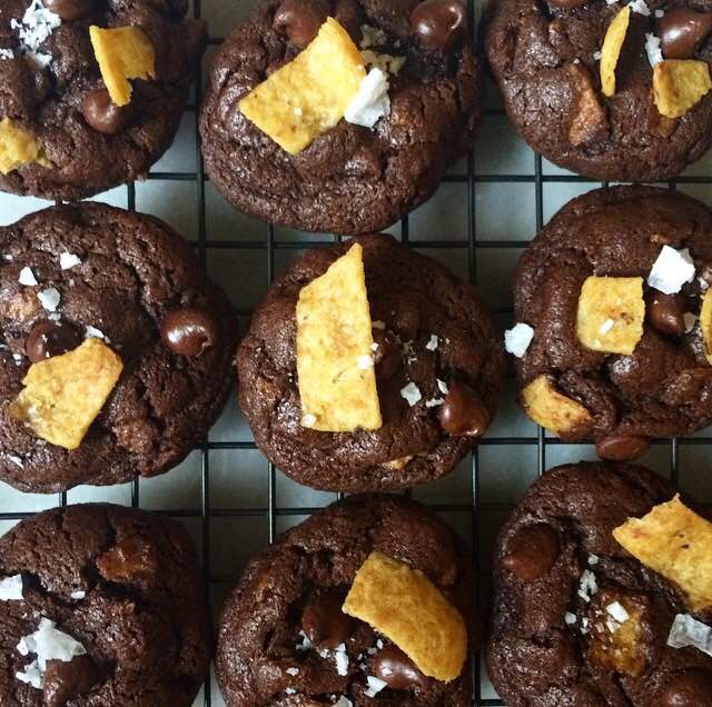 Enter these Double Chocolate Fritos Cookies. No, your eyes are not deceiving you. These cookies contain both chocolate and Fritos. If you’ve never tried chasing Fritos with chocolate chips, you are missing out. The salty, crunchy corn chips with sweet, melty chocolate are to. die. for. These cookies have a soft chocolate cookie base that has the taste and texture of fudgy brownies–make sure to try one warm from the oven! The cookie itself and the super melty chocolate chips…just do it. And the Fritos! They soften just slightly from the moisture in the cookie dough, but they retain a lot of crunch. They add so much chewy texture to these cookies! Their signature saltiness is somewhat masked by all the chocolate, but that’s easily remedied with a sprinkling of coarse sea salt. Yum.